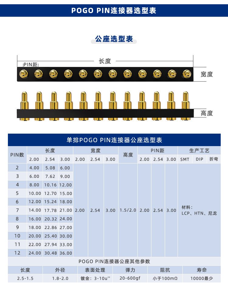Við hönnum, framleiðum og seljum hleðslupinna fyrir farsíma, rafhlöðupinna, loftnetspinna og aðra pogo pinna og tengi. Hástraumshleðslupinna Karl- og kventengi hafa einkenni lítillar stærðar, stórs straums, sterkra tengiliða og stöðugrar frammistöðu.